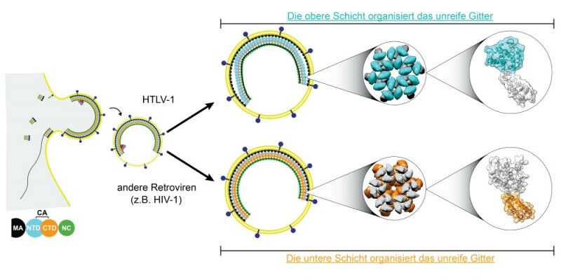 Es stellt sich die Frage, warum HTLV-1 eine so andere Gitterstruktur hat. Eine mögliche Erklärung könnte die einzigartige Übertragungsart des Virus sein. HTLV-1 bevorzugt nämlich den direkten Kontakt von einer infizierten Zelle zu einer nicht infizierten. HIV-1 hingegen nutzt eine zellfreie Übertragung. Es produziert Partikel, die sich mit dem Blutkreislauf ausbreiten können.