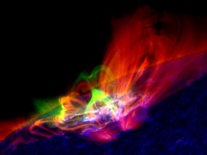 Aufnahmen der Sonnenkorona vom NASA-SDO-Satelliten bei unterschiedlichen Wellenlängen - Temperaturen - im Extremen Ultravioletten, angezeigt durch unterschiedliche Farben. Grün zeigt aufgeheiztes Sonnenplasma bei etwa zehn Millionen Grad an. Im Bereich des grünen X in der Mitte des Bildes brechen einander entgegengesetze Magnetfelder auf, um sich anschließen neu zu formieren. Bild: NASA SDO, Yang Su