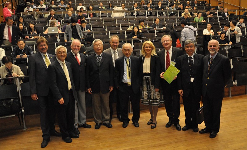 Vizerektor Peter Scherrer, Paul Tam, Dekan Karl Crailsheim, Yong-zheng Hui, Thomas Rajakovics, Yung-chi Cheng, Elisabeth Grossmann, Rudolf Bauer, Xin-sheng Yao und Paul Coates (v.l.) eröffneten gestern das prestigeträchtige Treffen des Consortium for Globalization of Chinese Medicine (CGCM).