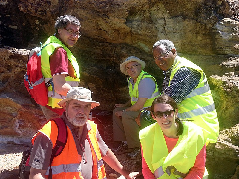 Die Forschungsgruppe im Feld: Aberra Mogessie und Melina Gamsjäger (r.), Jesús Martínez-Frías (l. vorne), Fernando Rull (r. ganz hinten) und Jesús Medina von der Universität Valladolid (l. hinten) Das Projektgelände auf Teneriffa
