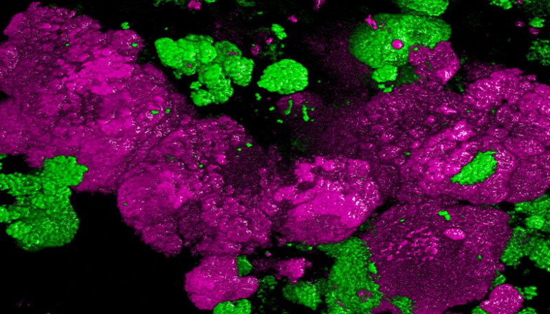 Zell-Aggregat von Nitrospira-Bakterien (pink) in Belebtschlamm aus einer Kläranlage. Die Kolonie besteht aus mehreren Tausend einzelner Nitrospira-Zellen. Kolonien anderer Bakterien sind grün dargestellt. Die Bakterien wurden durch Fluoreszenz in situ-Hybridisierung visualisiert (Copyright: Holger Daims).