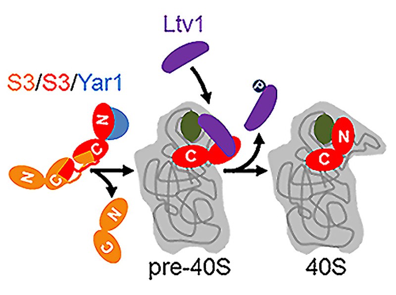 Das Protein Rps3 (l.) wird in zwei Schritten in den Zellkern eingebaut: Den genauen Mechanismus haben ForscherInnen der Uni Graz nun entschlüsselt. Grafik: Uni Graz/Pertschy