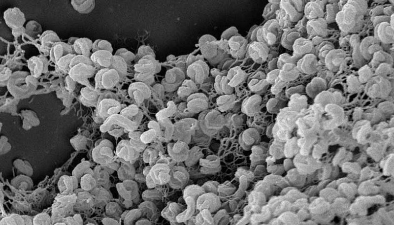 Elektronenmikroskopische Aufnahme eines Zell-Aggregats von Comammox-Bakterien der Art Nitrospira inopinata. Die spiralförmig gewundene Gestalt der Zellen ist gut erkennbar. Die Zellen haben einen Durchmesser von etwa 0,3 Mikrometer und sind bis zu 1,7 Mikrometer lang (Copyright: Anne Daebeler und Stefano Romano).