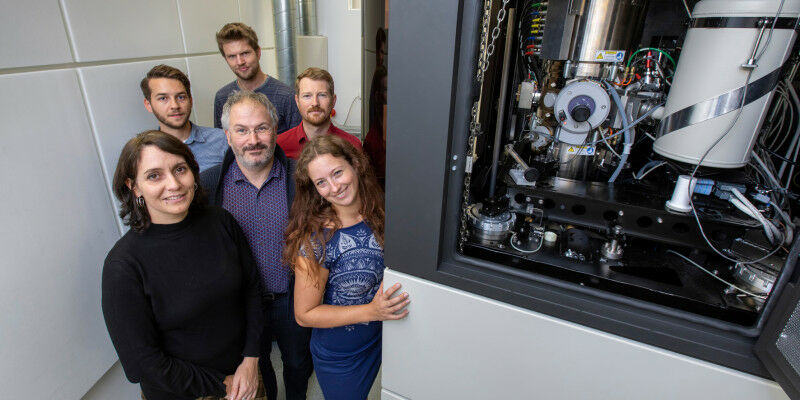 Gerald Kothleitner (centre) and his research team consisting of Maria Poletti and Angelina Orthacker (1st row, from left to right) as well as Johannes Tändl, Georg Haberfehlner and Bernhard Sonderegger (back, from left to right) describe for the first time those atomic processes that lead to the formation of more powerful alloy materials with the help of the Austrian Scanning Transmission Electron Microscope (ASTEM);