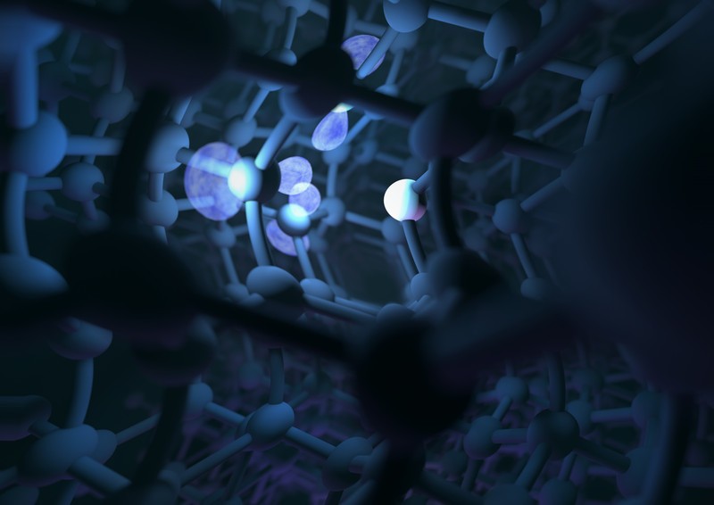 Im regelmässigen Diamantgitter gibt es spezielle Defekte, welche aus einem Stickstoff Atom (weiss) und einem fehlenden Kohlenstoff Atom bestehen. Die Elektronenwolken sind hellblau dargestellt.