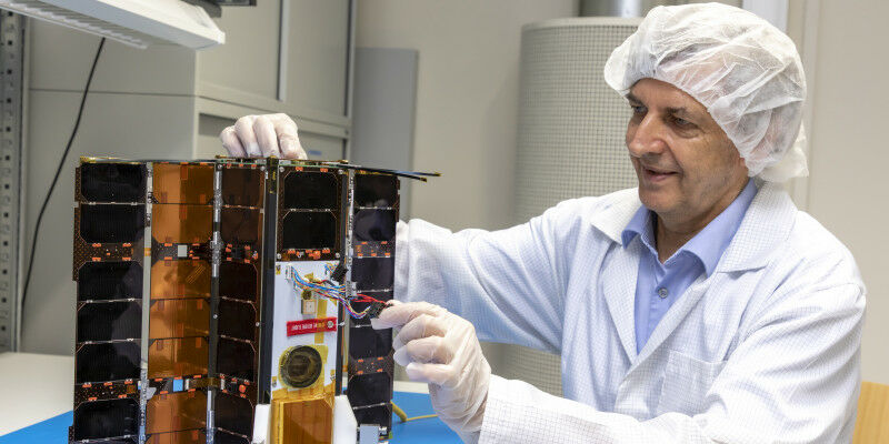 Small, but big enough to be a satellite: OPS-Sat - seen here with Otto Koudelka undergoing final testing in the laboratory in Graz - will begin orbiting the Earth in a few months. © Lunghammer - TU Graz
