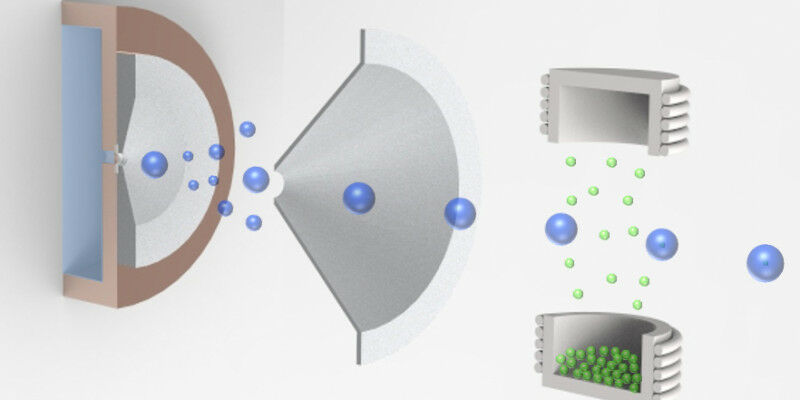 The graphic shows the pick-up technique for the aggregation of nanoparticles in cold helium droplets; © IEB - TU Graz
