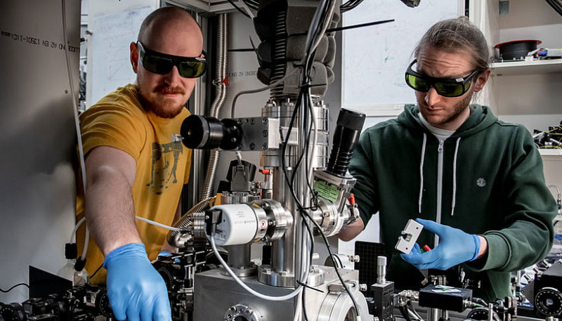 Wissenschafter aus Wien, Kahan Dare (links) und Manuel Reisenbauer (rechts), am Experiment, das ein schwebendes Nanoteilchen in seinen bewegten Quantengrundzustand kühlte.