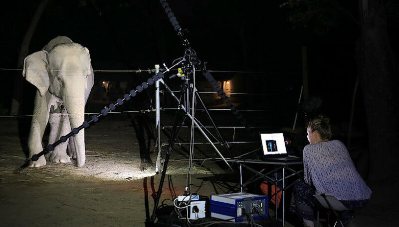 Mit dem sternförmigen Array aus Mikrofonen der akustischen Kamera vor dem Elefanten platziert warten die Forscher geduldig, dass der Elefant einen Laut von sich gibt, bis in die Abendstunden hinein.