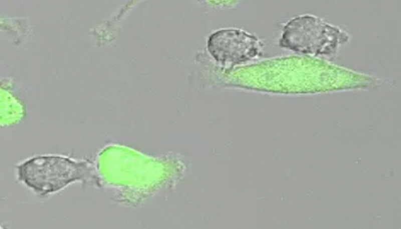 Makrophagen (grau) attackieren Tumorzellen ( grün ) © Manfred Ogris, Magdalena Billerhart, Universität Wien - Am Department für Pharmazeutische Wissenschaften der Universität Wien hat ein Forschungsteam einen Therapieansatz entwickelt, mit dem ein Tumorwachstum gestoppt werden könnte. Das Immunsystem schützt den Körper vor dem Entstehen von Krebs. Damit sich die Immunzellen nicht gegen gesunde Zellen wenden, bilden diese einen eigenen Schutzschild: Das Protein CD47 ist ein "Friss mich nicht"-Signal und zeigt den Immunzellen damit an, sie nicht anzugreifen. Aber auch Tumorzellen machen sich dieses Signal zu Nutze, indem sie vermehrt CD47 an ihrer Zelloberfläche präsentieren. Am Department für Pharmazeutische Wissenschaften der Universität Wien hat ein Forschungsteam um Manfred Ogris nun einen Therapieansatz entwickelt, mit dem die Tumorzellen selbst ein CD47-blockierendes und damit immunaktivierendes Fusionsprotein produzieren. Durch diese Therapie kann ein Tumorwachstum gestoppt werden. Auf Fresszellen, sogenannten Makrophagen, und anderen Immunzellen befindet sich ein Ligand für CD47, das Protein SIRP'.