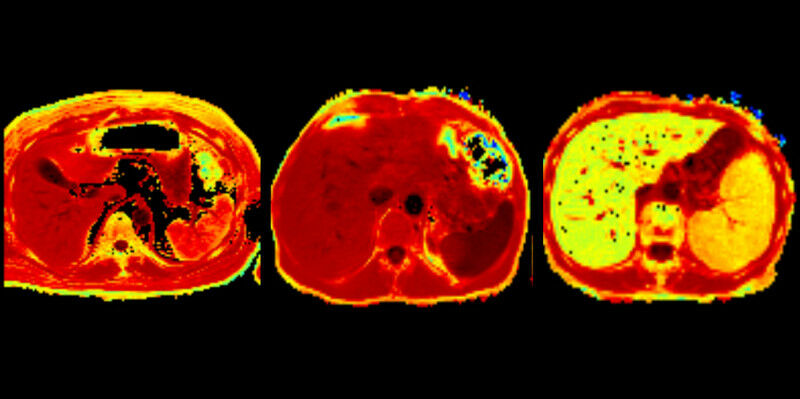 MRT R2* Sequenzen bei einem Patienten mit Anemia of inflammation / Entzündungsanämie (links), einem Kontrollpatienten ohne Entzündung (mitte) sowie einer Patientin mit transfusionsbedingter Eisenüberladung (rechts).