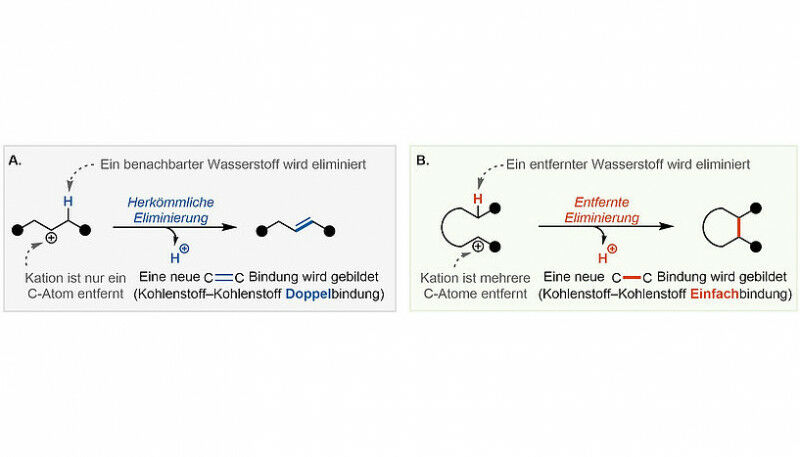 Wissenschafter der Universität Wien um Nuno Maulide haben nun eine neue C’H-Aktivierungsreaktion entwickelt, die das Selektivitätsproblem angeht und die Synthese komplexer kohlenstoffbasierter Moleküle ermöglicht. Durch das gezielte Anvisieren einer spezifischen C’H-Bindung mit bemerkenswerter Präzision öffnen sie Türen zu synthetischen Wegen, die bisher verschlossen waren. Die Maulide-Gruppe konzentriert sich auf sogenannte "Carbokationen" (d. h. Moleküle, die ein positiv geladenes Kohlenstoffatom enthalten) als Schlüsselzwischenprodukte. "Traditionell reagieren Carbokationen, indem sie ein Wasserstoffatom am Kohlenstoffatom benachbart zum Kation eliminieren und eine Kohlenstoff-Kohlenstoff-Doppelbindung im Produkt bilden", erklärt Nuno Maulide (Abbildung 2A). "Produkte mit Doppelbindungen - sogenannte Alkene - können äußerst nützlich sein. Manchmal ist jedoch eine Einfachbindung anstelle einer Doppelbindung gewünscht", fährt der mehrfache ERC-Preisträger fort. "Wir haben entdeckt, dass in bestimmten Fällen die Reaktivität einen neuen Weg einschlagen kann. Es kommt dann zu einer sogenannten ,entfernten Eliminierung’. Diese Reaktion führt zur Bildung einer neuen Kohlenstoff-Kohlenstoff-Einfachbindung - ein Phänomen, das bisher nicht untersucht wurde", erklären Phillip Grant und Milos Vavrík, Erstautoren der Studie (Abbildung 2B).