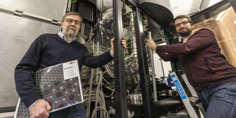 Ferdinand Hofer ( left ) and Daniel Knez next to the Austrian Scanning Transmission Electron Microscope (ASTEM) at the Institute of Electron Microscopy and Nanoanalytics at TU Graz. Image source: Lunghammer - TU Graz. Using only a single electron microscope image, researchers at TU Graz can determine the type and exact position of so-called guest atoms in high-tech materials. They also come closer to solving the mystery of the blue colour of aquamarine. In addition to their main components, the properties of crystalline and nanoporous materials often depend crucially on guest atoms or ions that are embedded in the tiny pores of their lattice structure. This applies to high-tech materials used in sensor or separation technology as well as to natural materials. The bluish gemstone aquamarine, for example, would be colourless without such guest components.