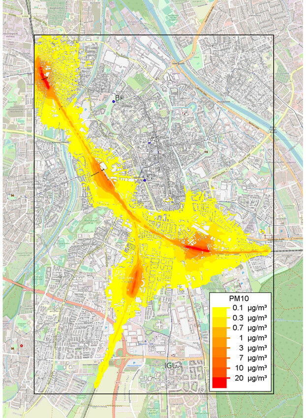 Dies gilt insbesondere für Bereiche entlang von Bahnstrecken, in denen verstärkt gebremst wird; dazu gehören Bahnhofszufahrten und Abschnitte mit Geschwindigkeitsbegrenzungen. Allein die Abriebemissionen der Schienenfahrzeuge erreichten in Augsburg entlang der untersuchten Bahnstrecken im Tagesmittel Werte von bis zu 25 Mikrogramm Feinstaub der Kategorie PM10 (Partikel mit einem Durchmesser von weniger als zehn Mikrometern) pro Kubikmeter. Dies entspricht bereits der Hälfte des zulässigen Grenzwertes von 50 Mikrogramm pro Kubikmeter.