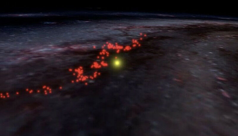 Aus der Originalpublikation: Interaktive 3D-Visualisierung der Sonnenumlaufbahn (gelb), ausgewählter Sternhaufen (blau) und ihrer Elternwolken (grau) über die letzten 30 Millionen Jahre (weitere Einzelheiten sind in der Veröffentlichung enthalten). Das Radcliffe-Wellenmodell (hellrot) ist in der Gegenwartsansicht dargestellt.