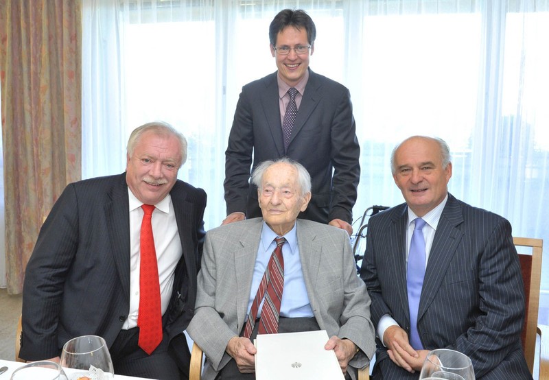 Bgm Michael Häupl, BV Adolf Tiller und Rainer Trefelik, Präsident des Fonds der Wiener Kaufmannschaft und "Hausherr" der Park Residenz Döbling, gratulieren Dipl-Ing. Wilhelm Mahler zum 106. Geburtstag. Foto: Schaub-Walzer