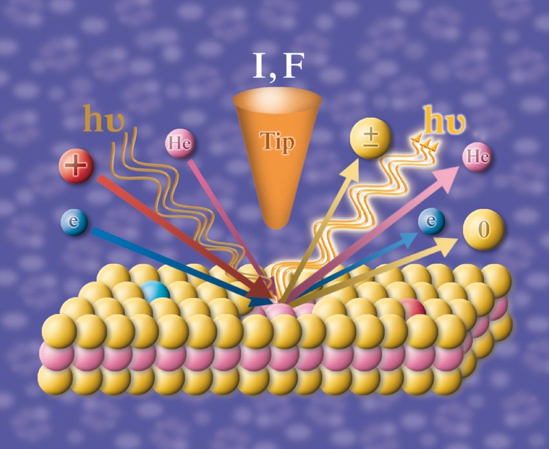 Schematische Darstellung der Untersuchung von Festkörpern mit verschiedenen physikalischen Analysemethoden.