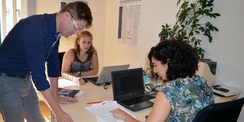 Laura and Maria are working in their own office at TU Graz. Also in this picture is Jörg Koppelhuber.