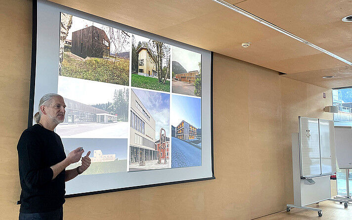 Kürzlich durften die Studierenden am Campus Kuchl einen besonderen Gast begrüßen: Der renommierte Architekt Tom Lechner gab in einem kurzweiligen und praxisnahen Vortrag Einblick in drei ausgewählte Holzbauprojekte seines Büros LP architektur ZT aus Altenmarkt. Auf Einladung von Manfred Stieglmeier, Studiengangsleiter Green Building, stellte Lechner drei interessante Bauprojekte vor.