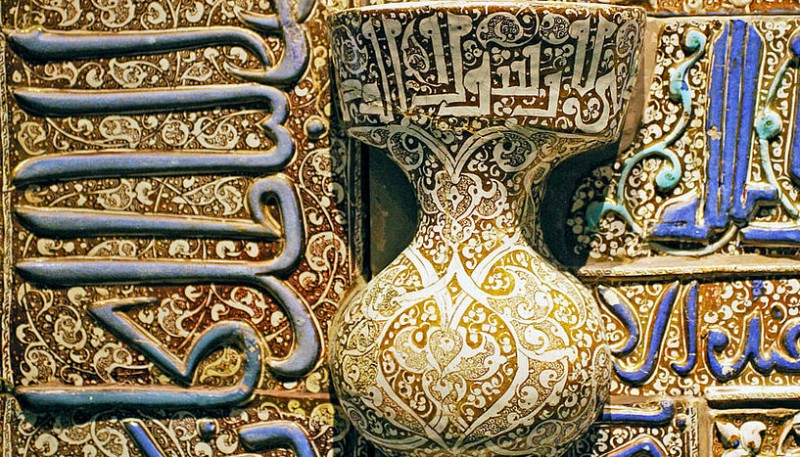 Detail einer Gebetsnische aus Lüsterkeramik aus dem Jahr 1226, ursprünglich in einer Moschee in Kashan/Iran. Museum für Islamische Kunst Berlin (Foto: M. Ritter).