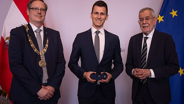 Nun durften sich gleich drei Absolventen der Johannes Kepler Universität Linz über diese Ehrung durch Bundespräsident Alexander Van der Bellen freuen: das Staatsoberhaupt überreichte die Ehrenringe.