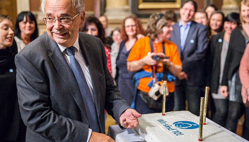 Zum ersten runden Geburtstag des Kinderbüros wurde zum Fest in den Großen Festsaal der Universität Wien geladen. Und Rektor Engl durfte die Torte anschneiden.