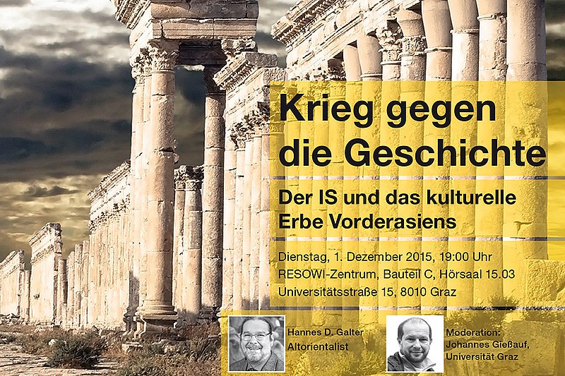 Die Welt erlebt derzeit in Syrien nicht nur eine menschliche Tragödie, sondern auch eine einzigartige Serie von Zerstörungen von Denkmälern durch den Islamischen Staat. Was an der Oberfläche als kompromisslose Verwirklichung des Verbotes von Abbildungen und Götzendienst im Koran aussieht, entpuppt sich bei näherem Hinsehen als perfektes Mittel zu verstärkter Medienpräsenz und gesteigertem Prestige. Altorientalist Univ.-Doz. Dr. Hannes D. Galter wirft im Gespräch mit Historiker Ass. Johannes Gießauf einen aufklärenden Blick auf die Hintergründe. Krieg gegen die Geschichte - der Islamische Staat und das kulturelle Erbe Vorderasiens - WANN: Dienstag, , 19:00 Uhr - WO: RESOWI-Zentrum, Hörsaal 15. Bauteil C, Erdgeschoß, Karl-Franzens-Universität Graz - Der Eintritt ist frei, um Anmeldung wird gebeten: - Tel.