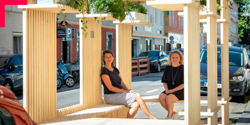Die Architektinnen und Stadtplanerinnen Eva Schwab und Aglaée Degros beim Verweilen im öffentlichen Raum. Die beiden TU Graz-Forscherinnen sind Überzeugt: Temporäre Stadtmöbel (sogenannte Parklets) wie jene hier am Bild, sind eine Möglichkeit von vielen, Orte wieder attraktiv und lebendig zu machen.