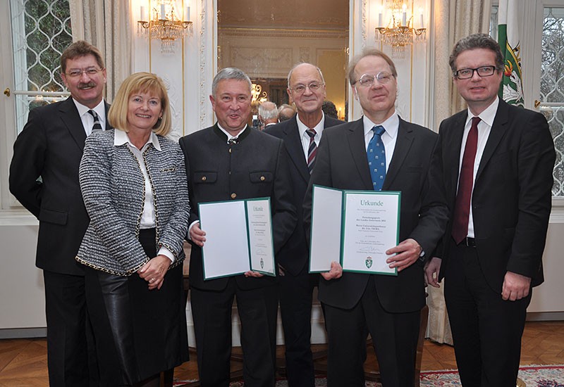 V.l.: Vizerektor Peter Scherrer, Rektorin Christa Neuper, Martin Moll, Laudator Karl Acham, Udo Thiel, Landesrat Christopher Drexler. Foto: Uni Graz/Pichler