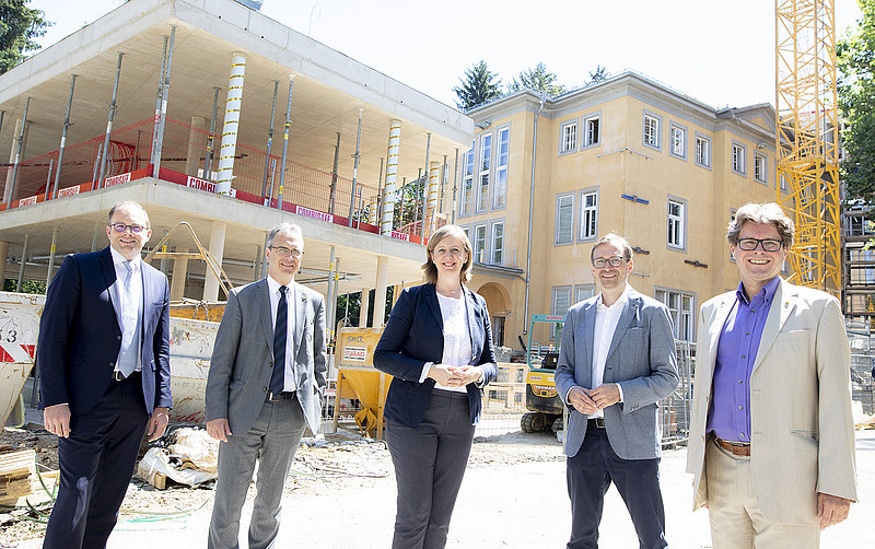 Das Zentrum für Wissens- und Innovationstransfer am Campus der Uni Graz nimmt Form an: Maximilian Pammer, Peter Riedler, Barbara Eibinger-Miedl, Bernhard Weber und Martin Polaschek (v.l.) luden zur Gleichenfeier auf die Baustelle in die Schubertstraße 6a. Foto: Uni Graz/Kanizaj