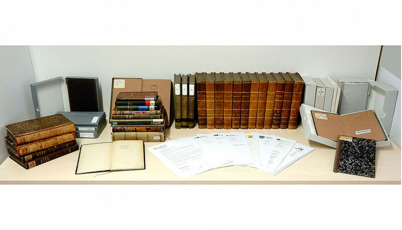 Abb. Die restituierten Bücher (©: Marc Drews) - In den Beständen von acht Bibliotheken Österreichs und Deutschlands konnten 42 Bücher von Heinrich Klang (1875-1954), der nach dem "Anschluss" Österreichs 1938 aufgrund seiner jüdischen Herkunft durch das nationalsozialistische Regime verfolgt wurde, identifiziert werden. Heinrich Klang war Universitätsprofessor in den Rechtswissenschaften. In einer gemeinsamen länderübergreifenden Restitution konnten am 13. Dezember 2022, koordiniert von der NS-Provenienzforschung der Universitätsbibliothek Wien, die Bücher an die Erb*innen zurückgegeben werden. Die Aktion steht im Zeichen einer andauernden Geschichtsaufarbeitung der Universität Wien. Die insgesamt 25 Werke in 42 Bänden konnten durch den Exlibris-Stempel "Doris J. Klang" als Doctoris James Klang (1847-1914), den Vater Heinrich Klangs, dessen Bibliothek gemäß Verlassenschaftsakt an seinen Sohn Überging, identifiziert werden. In insgesamt acht Österreichischen und deutschen Bibliotheken wurden die Bücher aufgespürt, darunter die Universitätsbibliothek Wien.