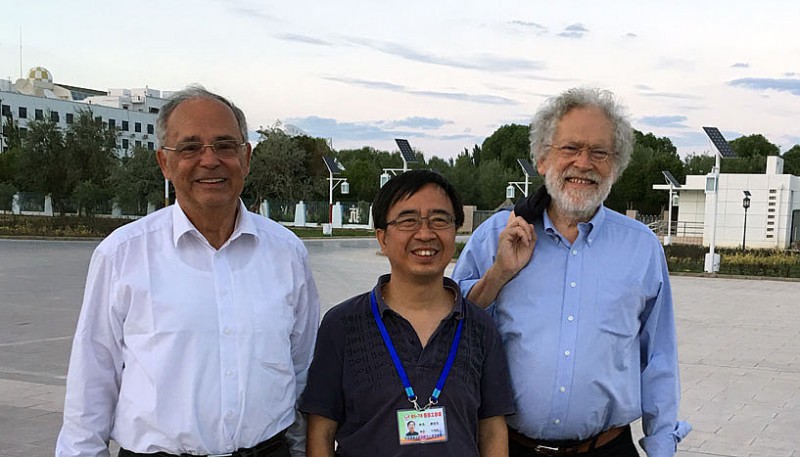 Der chinesische Projektleiter Pan Jianwei, der an der Universität Wien promoviert hat und ausländisches Mitglied der ÖAW ist, mit seinem Doktorvater Anton Zeilinger und Rektor Heinz W. Engl kurz vor dem Start des Quantensatelliten (Copyright: Universität Wien).