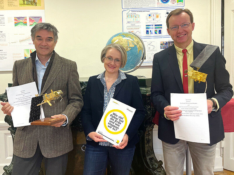 Vizerektor Joachim Reidl (l.) und Projektleiter Gottfried Kirchengast unterzeichneten den Kooperationsvertrag am 29. März 2022. Andrea Steiner ist Mitglied im Lenkungsausschuss des Exzellenzzentrums ROM SAF. Foto: Uni Graz/Rogenhofer - Die Wettervorhersage und die Klimabeobachtung weiter zu verbessern, sind Kernziele von EUMETSAT, der europäischen Organisation für die Nutzung meteorologischer Satelliten mit 30 Mitgliedsstaaten. Eines ihrer acht Exzellenzzentren hat nun die Universität Graz an Bord geholt. Den Ausschlag dafür gab die Expertise des Wegener Center in der satellitengestützten Klimabeobachtung. Als Turbo für die Forschung auf diesem Gebiet stellt EUMETSAT gemeinsam mit der Österreichischen Forschungsförderungsgesellschaft FFG für die nächsten fünf Jahre 840.