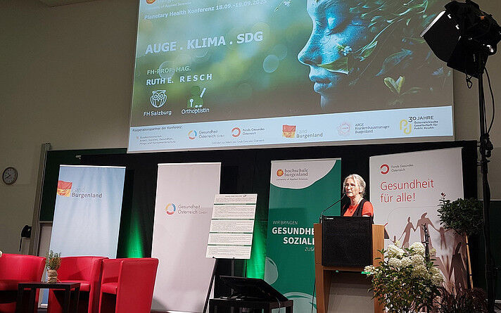 Im Rahmen des Planetary Health Kongresses (17.-19. September 2025, Burgenland) wurde unter dem Motto ,,Gesundheitsförderung im (Klima)wandel" die Bedeutung klimabewusster Ausund Weiterbildung betont. Der Kongress stärkte die Umsetzung der SDGs, insbesondere in den Bereichen Gesundheit, Bildung und Klimaschutz. Die FH Salzburg war mit einem Fachbeitrag vertreten. Mag. Ruth Resch, Studiengangsleiterin Orthoptik, referierte zum Thema Augengesundheit im Klimawandel - einem oft vernachlässigten Bereich. Sie zeigte auf, wie insbesondere die Hitzebelastung die Augen beeinträchtigen, und thematisierte Projekte und Ansätze zur Reduktion von Ressourcenverbrauch bei Augenbehandlungen.