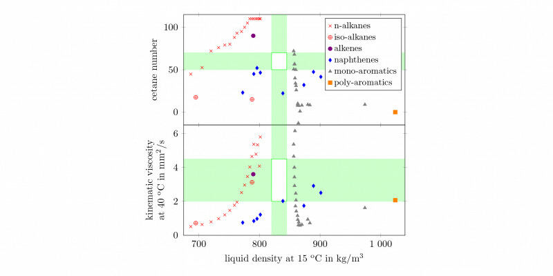 Figure 1: Density, kinematic viscosity and cetane number of typical fuel components together with the associated specifications for European diesel fuels (highlighted in green). The middle area indicates the area to be fulfilled simultaneously for both properties according to DIN EN 590. This must be hit by the resulting surrogate.