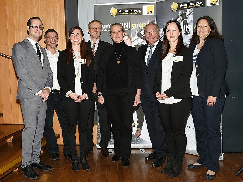 V.l.: Gernot Dreisiebner und Franz Gramlinger vom WiPäd-Institut, Studierende Antonia Staller, Studiendekan Heinz Königsmaier, Michaela Stock, Leiterin des WiPäd-Instituts, Günther Witamwas, Geschäftsführer des SOWI-AbsolventInnenvereins, Studierende Claudia Reiterer und Elisabeth Riebenbauer, Vorsitzende der Curricula-Kommission für die WiPäd. Fotos: Uni Graz/Pichler