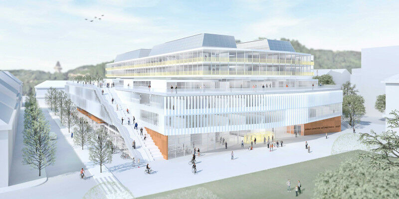 Das Graz Center of Physics in der Außenansicht. Der Entwurf ist auf sechs Obergeschoße und zwei Untergeschoße organisiert. Zwei Highlights: die Stadtterrasse, die auch über Außentreppen erreichbar ist, und fünf holzverkleidete Hörsäle im Ergeschoß. Aberjung GmbH Von TU Graz Medienservice - Beim Graz Center of Physics handelt es sich um eines der größten Universitätsbauprojekte Österreichs. Wissenschaftsministerium, BIG, Universität Graz und TU Graz präsentierten kürzlich das Siegerprojekt des Architekturwettbewerbs. Das Graz Center of Physics wird die Physik-Institute von Universität Graz und TU Graz an einem gemeinsamen Standort vereinen und entsteht bis 2030 am Campus der Uni Graz anstelle der heutigen Vorklinik. Die Universitäten werden mit dem Graz Center of Physics die Synergien in Forschung, Lehre und Infrastruktur weiter stärken und der Grazer Physik zu noch größerer internationaler Sichtbarkeit verhelfen.