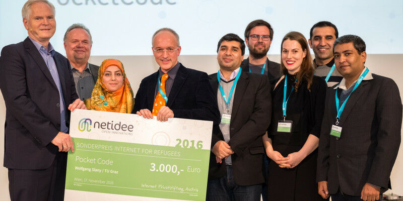 Another prize for the programming app ’Pocket Code’: (form left) Ernst Langmantel, head of the Internet Foundation Austria, juror Kilian Kleinschmidt with Sareh Choupani, Wolfgang Slany, Aiman Awwad, Matthias Müller, Anja Petri, Zulfiqar Ali and Kirshan Luhana from TU Graz. © netidee, Alex Müller