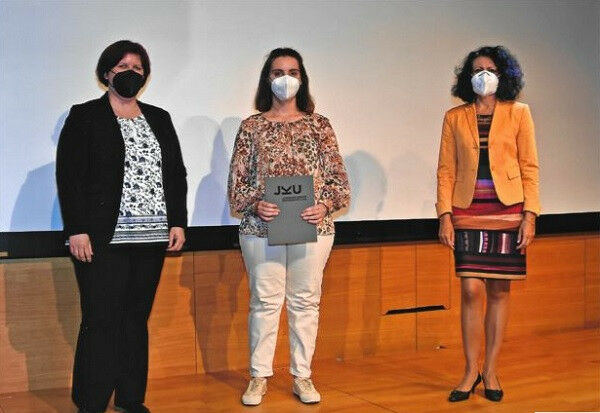 Links: Referatsleitung Gender & Diversity Management Mirjam Strecker, Stipendiumträgerin Deena Awny, Vizerektorin Alberta Bonanni; Credit: Paul Hamm - Im Rahmen des Young Research Awards wurden auch die Preisträger*innen der Iris Fischlmayr Preise & Stipendium 2020 gewürdigt. Im Rahmen der IRIS-FISCHLMAYR - Preise werden herausragende wissenschaftliche Diplombzw. Masterarbeiten sowie Dissertationen mit Diversitätsbezug gefördert, während das IRIS-FISCHLMAYR - Stipendium ein Dissertationsstipendium zur Förderung des weiblichen wissenschaftlichen Nachwuchses in den technisch-naturwissenschaftlichen Disziplinen darstellt. Im Bereich der Masterund Diplomarbeiten gab es 21 Einreichungen. Durch die Vielzahl der Einreichungen entschied sich die Jury am 02. September 2020 das Preisgeld des - ursprünglich - einen Preises zu erhöhen und durch drei Preisträger*innen zu teilen. Diese sind: Sarah Widter, Fabian Wakolbinger und Verena Sanglhuber. In der Kategorie Dissertation wurde Ruta ÅoeeromskytÄ— ausgezeichnet.