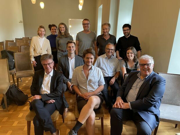 Links: vorne: Birklbauer, Julian Sigl (Schauspieler, spielt in der Inszenierung den 'K'), Vizepräsident des OGH Neumayr; zweite Reihe sitzend: Brezina, Resch, Anja Jemc (Regieassistenz); stehend hinten von rechts: Dramaturg Martin Mader und Regisseur Peter Wittenberg und weitere Mitglieder des Schauspielensembles - Spannender Brückenschlag von Wissenschaft und Kunst: Am 23. September 2022 hat Kafkas ,,Der Prozess" Premiere am Linzer Landestheater. Beraten wurden Regisseur Peter Wittenberg und Intendant Herrmann Schneider von Expert*innen: den Jurist*innen der Johannes Kepler Universität Linz. Dazu trafen sich das Regieteam, Schauspieler*innen und andere Ensemblemitglieder mit Jurist*innen wie Prof. Alois Birklbauer und Reinhard Resch (beide JKU) sowie Honorarprofessor Matthias Neumayr (Vizepräsident des OGH). Auch die studentische Perspektive floss durch Gernot Brezina (ÖH Jus) ein. Inhaltlich tauschte man sich über das Leben von Kafka (immerhin Jurist der gesetzlichen Unfallversicherung in Prag) ebenso aus wie über die besondere Situation der Hauptfigur ,,K" im Prozess. Gerade das Fehlen rechtsstaatlicher Prinzipien ermöglicht erst die dystopische Hilflosigkeit gegenüber dem System. ,,Der Austausch war für unsere Produktion sehr ergiebig.