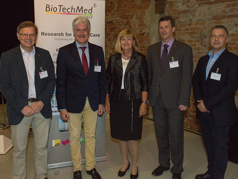 Gemeinsame Forschung am Standort: BioTechMed-Koordinatoren Rudolf Stollberger und Harald Mangge, Uni-Rektorin Christa Neuper, TU-Vizerektor Horst Bischof, Markus Steppan, BioTechMed-Koordinator für die Uni Graz (v.l.) Fotos: BioTechMed-Graz