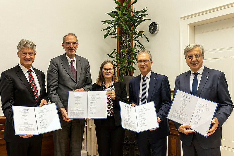 Hoben das Cori-Institut aus der Taufe: Harald Kainz (TU Graz), Heinz Faßmann und Ulrike Diebold (Präsident und Vizepräsidentin der ÖAW), Peter Riedler (Uni Graz) und Hellmut Samonigg (Med Uni Graz); Foto: Jimmy Lunghammer - Forschungsinstitut für Stoffwechselstörungen startet - Kooperationsvertrag unterschrieben Krebs, Immunschwächen oder Herz-Kreislauf-Erkrankungen sind die größten gesundheitlichen Herausforderungen der Wohlstandsgesellschaft. Häufige Ursache sind Stoffwechselstörungen. Das neu gegründete Cori-Institut - eine Einrichtung der Österreichischen Akademie der Wissenschaften (ÖAW) - soll in Zusammenarbeit mit Uni, TU und Med Uni Graz der Grundlagenforschung in diesem Bereich weiteren Aufschwung verleihen und Erkenntnisse schneller der Praxis zugänglich machen. "Die Gründung ist ein denkwürdiges Eregnis", unterstrich ÖAW-Präsident Heinz Faßmann, der am 10. Oktober 2022 mit den Rektoren Harald Kainz, Peter Riedler und Hellmut Samonigg den Kooperationsvertrag unterzeichnete. "Gemeinsam kann man mehr bewegen. Aufgrund der langjährigen Zusammenarbeit der drei Universitäten ist der Forschungsverbund BioTechMed-Graz ist die logische und ideale Andockstelle für das Institut", erklärte Minister Martin Polaschek bei der Vertragsunterzeichnung. Das Land Steiermark wird "einen höheren einstelligen Millionenbetrag" in die Forschungsinfrastruktur investieren, wie Landesrätin Barbara Eibinger-Miedl zusicherte.