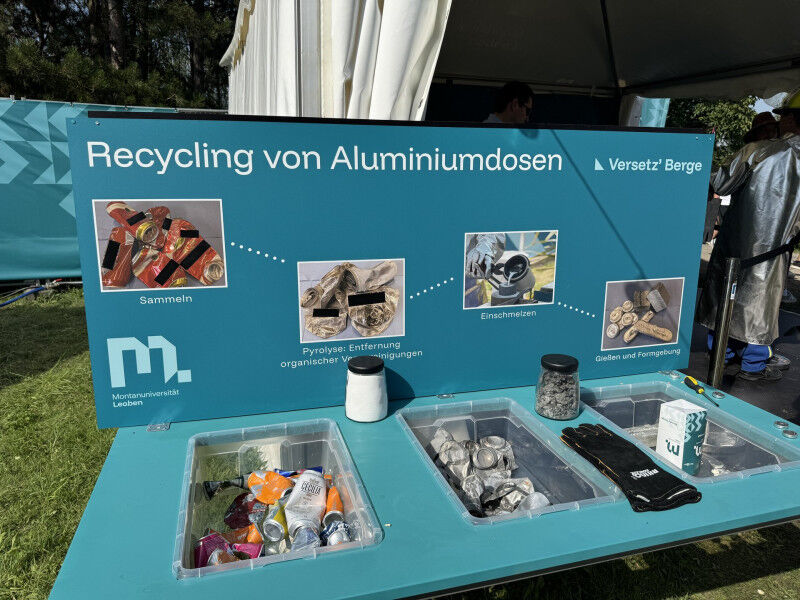 Mitten im Festivaltrubel können Besucher*innen Aludosen (ohne Pfandsymbol) einschmelzen und daraus vor Ort eigene Erinnerungsmünzen prägen. Begleitet wird der Prozess von den Expert*innen des Lehrstuhls für Nichteisenmetallurgie , die zeigen, wie aus vermeintlichen Abfallstoffen großartige Erinnerungsstücke entstehen können. Auch das Recycling von PET-Flaschen wird von den Forscher*innen des Departments Kunststofftechnik verständlich und anschaulich vorgeführt.