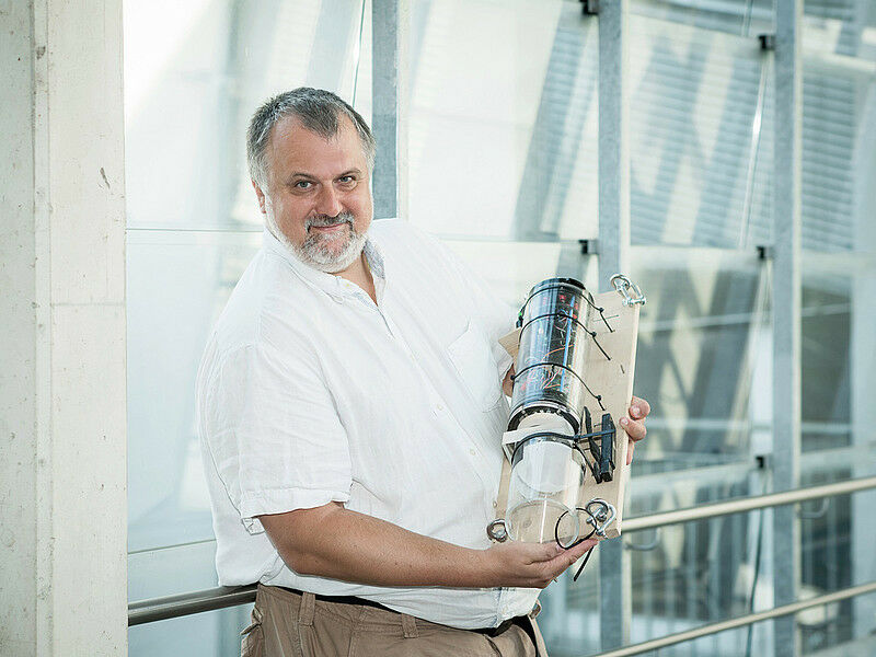 Ronald Thenius präsentiert ein 'biohybrides' Wesen: einen Roboter, der Kleintiere als Sensoren verwendet. Foto: Uni Graz/Thenius - Was wäre, wenn Muscheln Alarm schlagen, dass das Futter ausgeht? Krebse darauf aufmerksam machen, dass die Wasserqualität nicht stimmt? All das funktioniert tatsächlich - mit einem Roboter als Übersetzer": Ronald Thenius, Biologe an der Universität Graz, entwickelt im Rahmen eines EU-Projekts einen Apparat, der zu einem großen Teil aus lebenden Tieren und Pflanzen besteht. Muscheln reagieren beispielsweise sehr sensibel auf Änderungen im Nahrungsangebot oder Umweltgifte. Ihr Verhalten liefert dieselben Informationen wie teure und wartungsintensive Sensoren. ,,Beobachtet man unterschiedliche Spezies gleichzeitig, bekommt man ein sehr gutes Bild der Wasserqualität", beschreibt Thenius. Der Roboter besteht - abgesehen von den zentralen technischen Elementen im Inneren - aus biologisch abbaubaren Materialien. Kleine Röhrchen dienen als Nistplätze für jene Lebewesen, die für das Monitoring eingesetzt werden sollen.