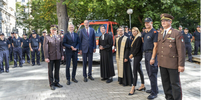 Vor dem neuen Feuerwehrauto der FF TU Graz (v.l. Landesbranddirektor Reinhard Leichtfried, Stadtrat Günter Riegler, Bundesminister Heinz Faßmann, Pfarrer Friedrich Eckhardt von der Christuskirche Graz, Hochschulseelsorger Alois Kölbl, Landesrätin Juliane Bogner-Strauß, TU Graz-Rektor und Kommandant Harald Kainz sowie der stellvertretende Landesfeuerwehrkommandant Erwin Grangl. Von Susanne Filzwieser - Die Freiwillige Feuerwehr der TU Graz hat ein brandneues Mannschaftstransportfahrzeug. Im Beisein von Bundesminister Faßmann und steirischer Politprominenz wurde das Fahrzeug gesegnet und mit einer Christophorus-Plakette versehen. Die Freiwillige Feuerwehr der TU Graz ist um einen motorisierten Kameraden reicher: Ein Mercedes Sprinter tut fortan seinen Dienst als Mannschaftstransportfahrzeug der ersten Universitätsfeuerwehr Österreichs. Bei der feierlichen Fahrzeugsegnung durch Hochschulseelsorger Alois Kölbl am Donnerstag, 23. September 2021, waren neben Rektor Harald Kainz auch Bundesminister Heinz Faßmann, Landesrätin Juliane Bogner-Strauß und Stadtrat Günter Riegler anwesend. Der rote Bus wird künftig Mitglieder der Freiwilligen Feuerwehr TU Graz transportieren und beispielsweise zu Ausbildungseinheiten, Projekttreffen oder Gruppenübungen fahren.
