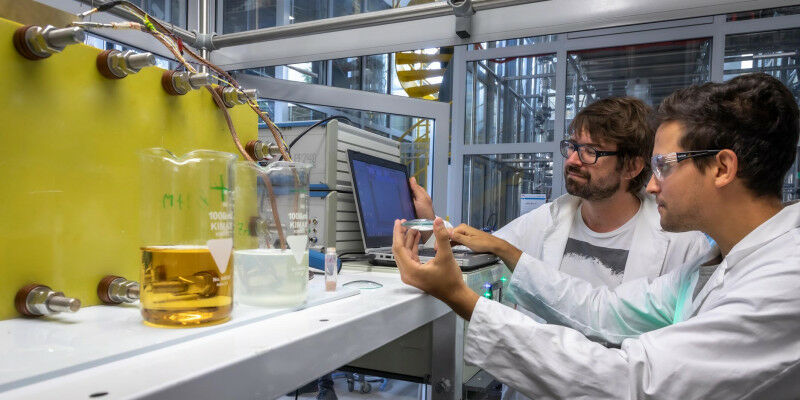 Gemeinsam mit ihren Kolleginnen und Kollegen an der TU Graz sowie mit Forschungspartnern aus dem In- und Ausland untersuchen Stefan Spirk (l.) und Werner Schlemmer die Umwelt- und Sicherheitsaspekte von flüssigen Elektrolyten in Redox-Flow-Batterien.