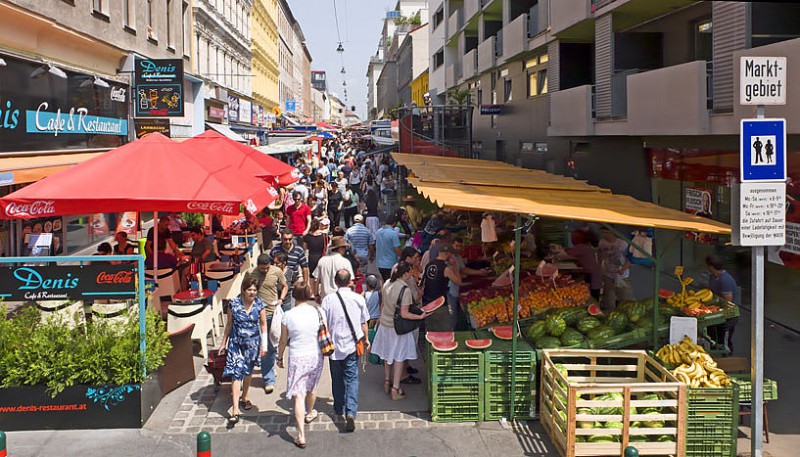 Das Grätzl rund um den Wiener Brunnenmarkt hat sich mit seinem Multi-Kulti-Image in den letzten Jahren zum angesagten Treffpunkt und Beispiel gelebter Integration entwickelt (Copyright: Peter Gugerell, via Wikimedia Commons).