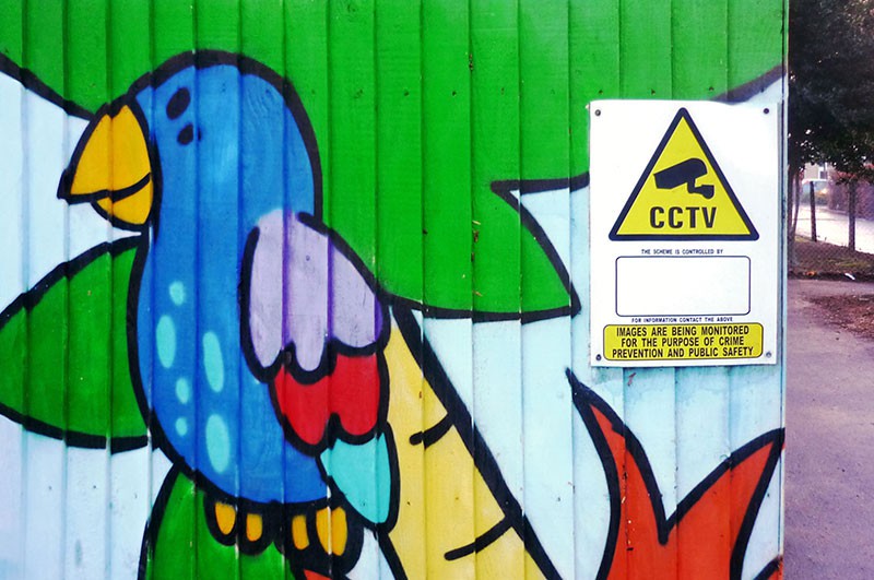Sicherheitsmaßnahmen durchdringen den Alltag: Dieser Eingang einer Volksschule in der Stadt Bath im Südwesten Englands mit fröhlich-buntem Papagei wird videoüberwacht. Die Kamera soll mögliche Straftäter davon abhalten, auf das Schulgelände zu kommen - aber auch die "öffentliche Sicherheit" gewährleisten. Foto: Eisch-Angus.