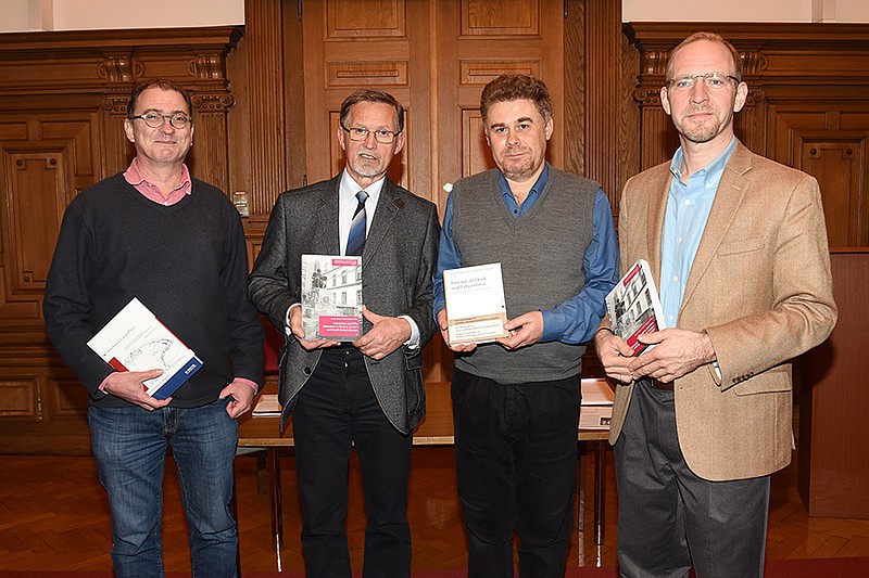 Neue Sammelbände zum Forschungsschwerpunkt Südosteuropa - unter anderem mit Beiträgen von Erdwissenschafter Bernhard Hubmann, den Historikern Harald Heppner und Dorin-Joan Rus sowie Politikwissenschafter Florian Bieber (v.l.) Foto: Uni Graz/Schweiger