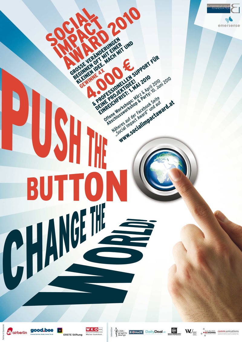 Noch bis 1. Mai 2010 haben Studierende die Möglichkeit, Projekte einzureichen, die ein gesellschaftliches Problem auf unternehmerische und kreative Weise bearbeiten. Wer durch die aktuelle Medienlandschaft streift, begegnet ihnen fast täglich: den zahlreichen Herausforderungen unserer Gesellschaft, wie Rassismus, Naturkatastrophen oder Armut. Um eigeninitiierte Projekte zu unterstützen, zeichnet der Social Impact Award Studierende aus, die mit selbst gegründeten Projekten gesellschaftliche Herausforderungen auf unternehmerische und kreative Weise bearbeiten. Gewinn und professionelle Unterstützung für das Projekt Der Social Impact Award unterstützt die besten Einreichungen mit Preisen, die es den GründerInnen ermöglichen, sich in der erfolgskritischen Anfangsphase voll und ganz auf das Projekt zu konzentrieren. Die vier überzeugendsten Teams werden mit Stipendien zu ¤ 4.000,- ausgezeichnet. Die Auswahl übernimmt eine Fachjury. Einreichfrist: 1. Mai 2010 Nähere Informationen erhalten Sie oder unter www.socialimpactaward.at.